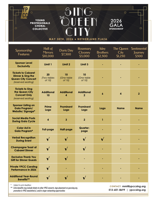 Join the Young Professionals Choral Collective (YPCC) in collaboration with Queen City Cabaret for our most glamorous event of the season! We are transforming the breathtaking Hall of Mirrors at the Hilton Netherland Plaza into a roaring twenties cabaret for an unforgettable night of music, community, and Art Deco elegance. Learn more about becoming a sponsor below!